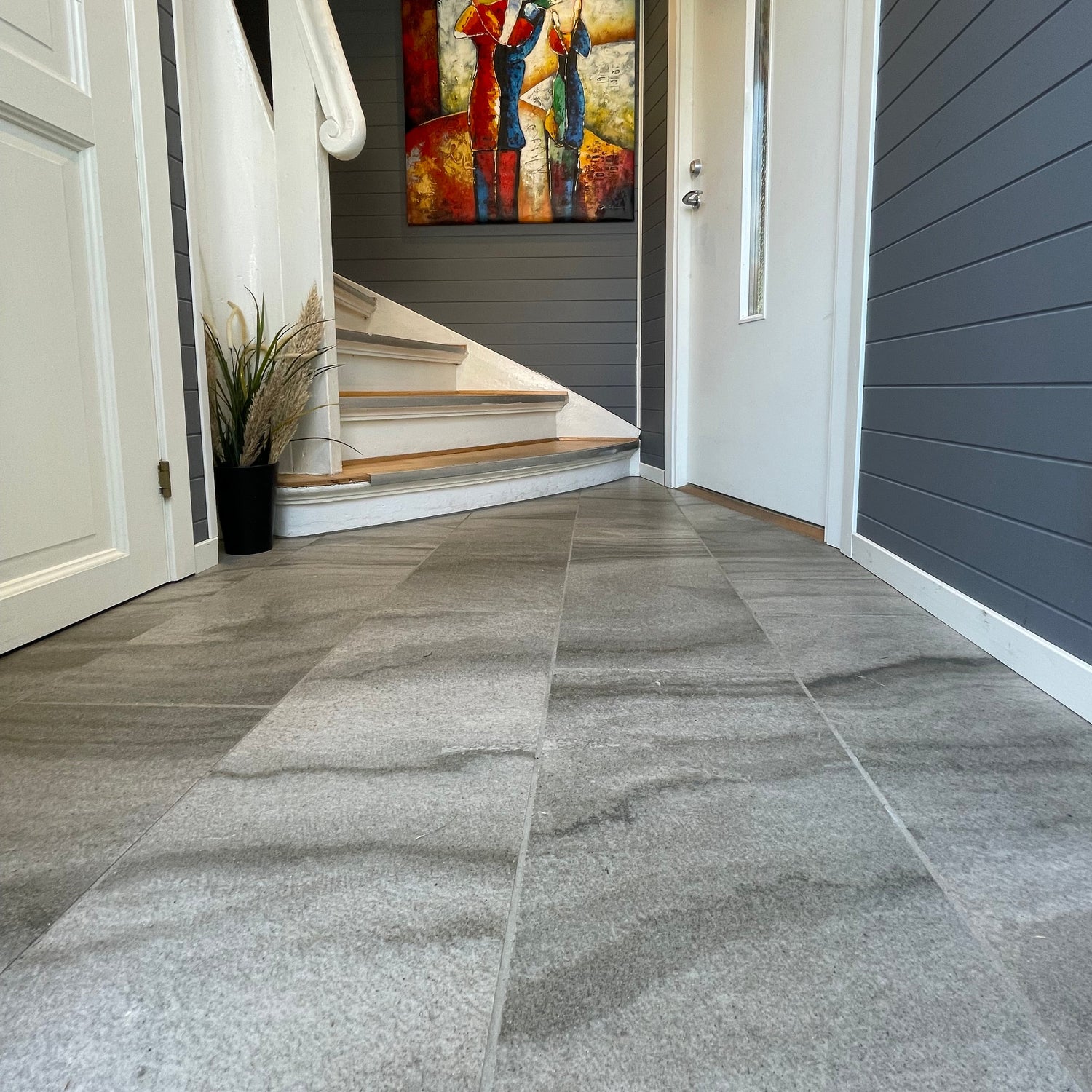 Flisene er blokksaget, noe som gjør at diamantsagbladene skjærer gjennom skiferens lag uten å følge dem helt. Resultatet er en overflate med mer naturlig spill og et raffinert uttrykk. Etter sliping får skiferen en jevn, moderne finish som fremhever de subtile strukturene og den lyse fargetonen.