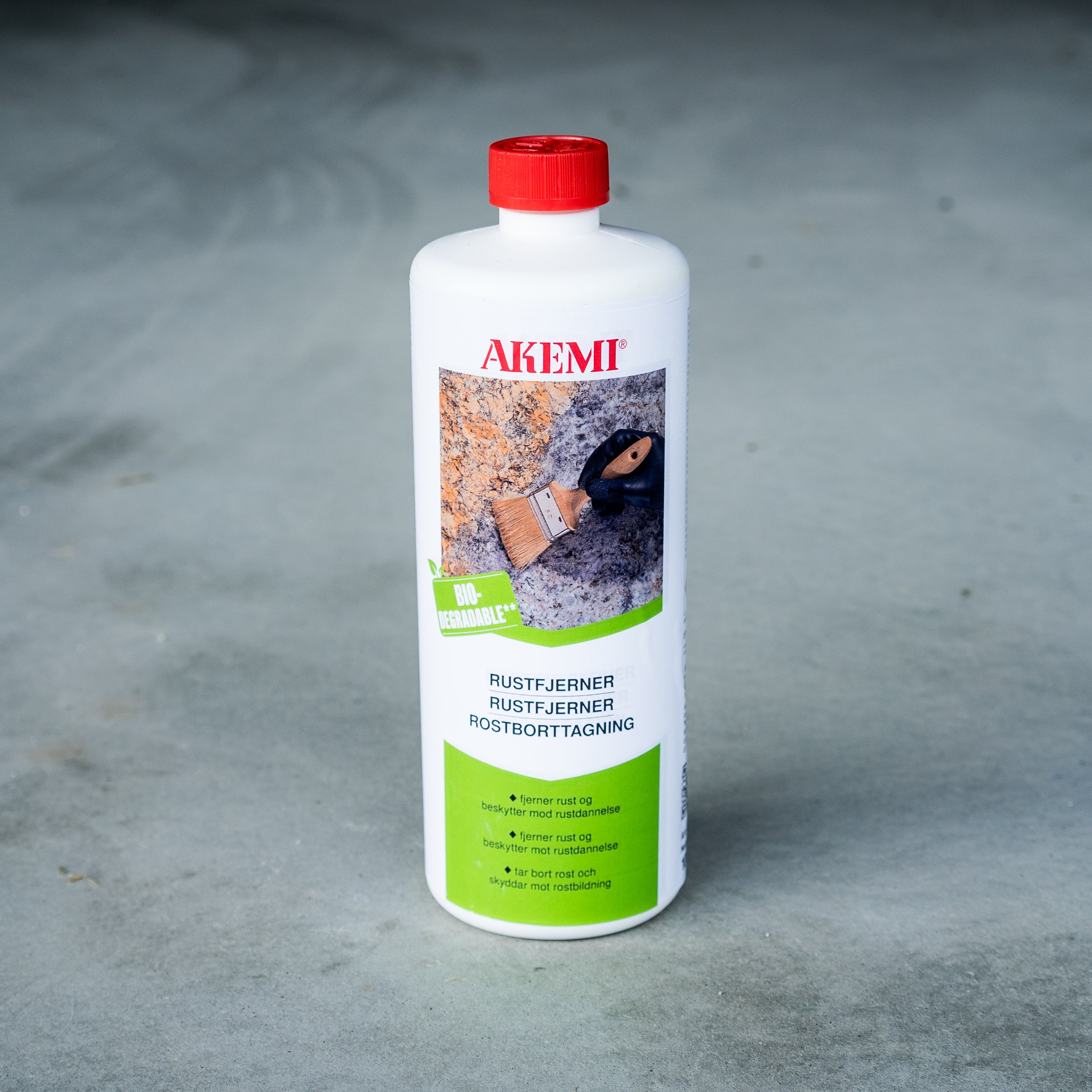 Akemi Rustfjerner er spesialutviklet for å fjerne rust og rustflekker fra syrefaste natur- og kunststeiner. Produktet omdanner rusten og gir en langvarig beskyttelse mot nye angrep.