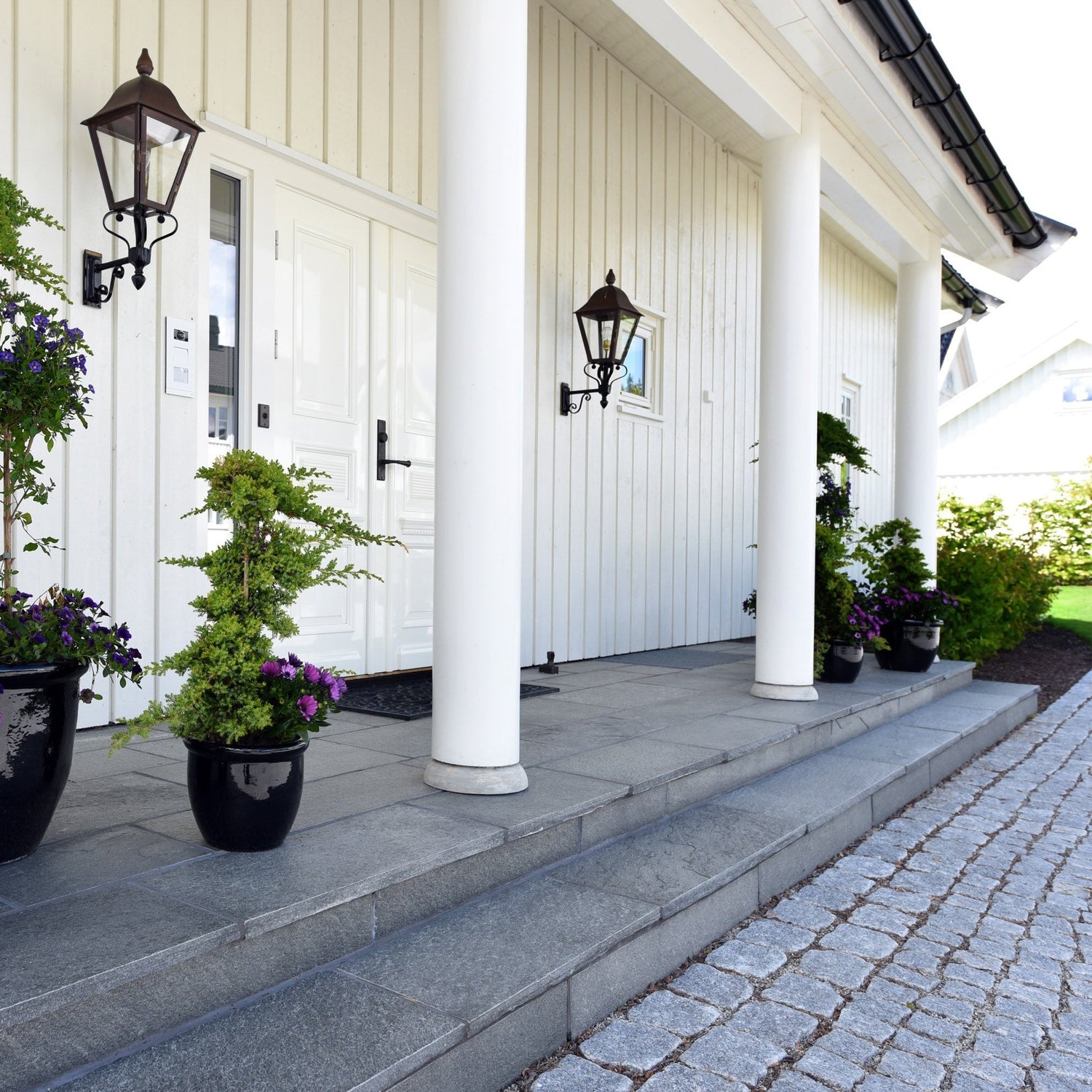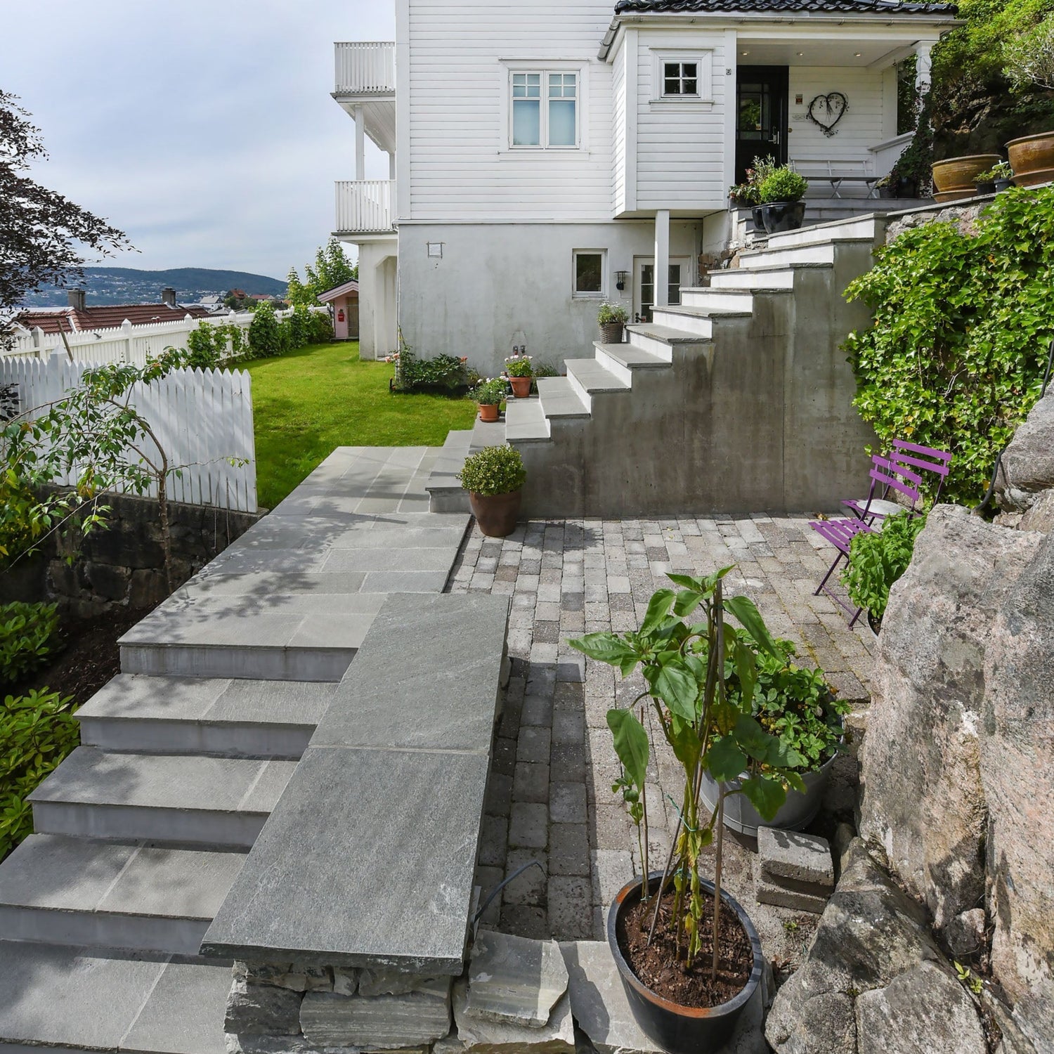 Trappetrinn i skifer er tidløst og vakkert. Trappen blir både sklisikker og frostsikker gjennom generasjoner. Skifertrinn tåler tunge tråkk, kulden fra nordiske klima og heftige stormer. Med hugget kant får du frem den rå naturen i skiferen og kanten står pent mot overflaten på trinnet.